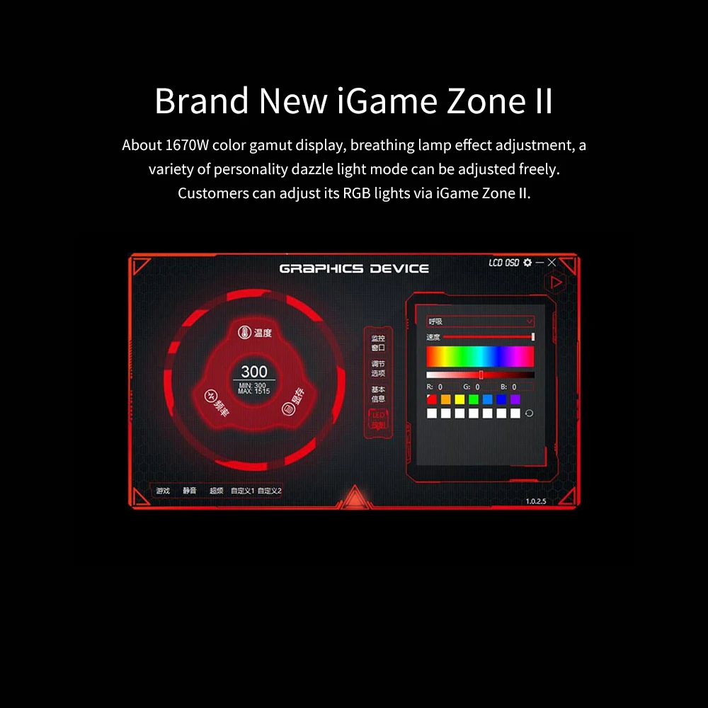 About 1670W color gamut display, breathing lamp effect adjustment, a variety of personality dazzle light mode can be adjusted freely.Customers can adjust its RGB lights via iGame Zone II.