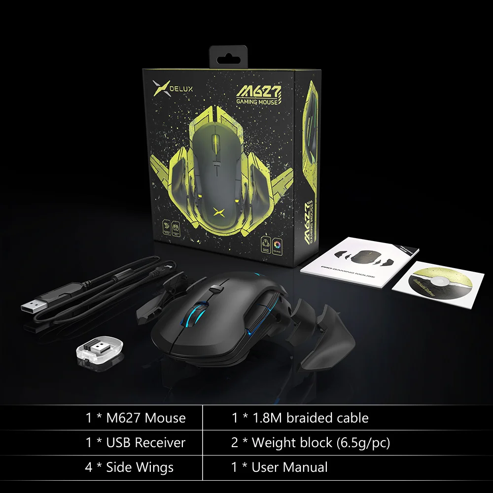 Features:Specifications: Box Contains: PMW3389 OPTICAL SENSOR Born For e-sport games,up to 16000 DPI,high speed sensitive tracking.The perfect combination of mouse and hand speed seamlessly satisfy needs of player in shootcuts. DIY SIDE WINGS DIY WINGS,DIFFRENT MATCH FOR DIFFERENT GAME For Both Right and Left Hand Users DUAL MODE SWITCH 2.4Ghz Wirelsss + Type-C Wired two modes Gaming Mouse CUSTOMIZED KEYS Customize Keys,Lighting,DPI More function waiting for your exploration Driver Download link: http://www.deluxworld.com/en/service/download/ COMFORTABLE FEELING FOR LONG TIME USE Ergonomic streamline design Relax yourself during long-time operatin EVERY DETAIL SURPRISES YOU SO MUCH Matte skin-like paint, anti-sweat,anti-slip Five gears DPI (Segent indicator light) Cold RGB lighting effects enhance e-esport gaming atomosphere FAQ Q: Driver Download linkA: http://www.deluxworld.com/en/service/download/