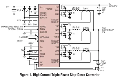 The LTC3733 family are PolyPhase® synchronous stepdown switching regulator controllers that drive all N-channel external power MOSFET stages in a phase-lockable, fixed frequency architecture. The 3-phase controller drives its output stages with 120° phase separation at frequencies of up to 530kHz per phase to minimize the RMS current dissipated by the ESR of both the input and output filter capacitors. The 3-phase technique effectively triples the fundamental frequency, improving transient response while operating each phase at an optimal frequency for efficiency and ease of thermal design. Light load efficiency is optimized by using a choice of output stage shedding or Burst Mode technology. A differential amplifier provides true remote sensing of both the high and low sides of the output voltage at load points. Soft-start and a defeatable, timed short-circuit shutdown protect the MOSFETs and the load. A foldback current circuit also provides protection for the external MOSFETs under short-circuit or overload conditions. An all-“1” VID detector turns off the regulator after 1µs timeout.