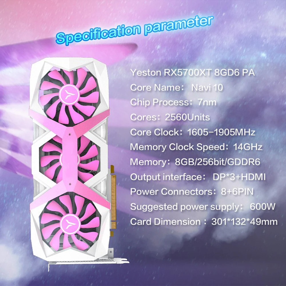 Yeston Radeon RX 5700 XT GPU 8GB Graphics Cards Gaming Desktop computer PC Video support DP/HDMI PCI-E X 256bit Basic specification parameters: