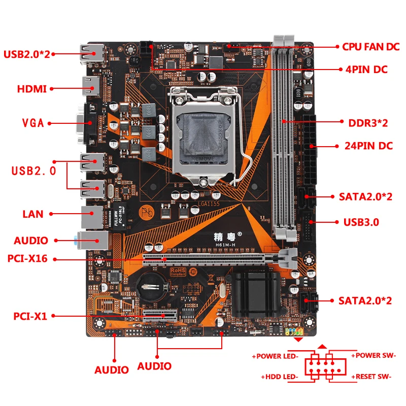 | H61 Motherboard LGA 1155 Dual Channel DDR3 Memory Micro-ATX Integrated Graphics Support Intel i3 i5 i7 H61M-H Mainboard |