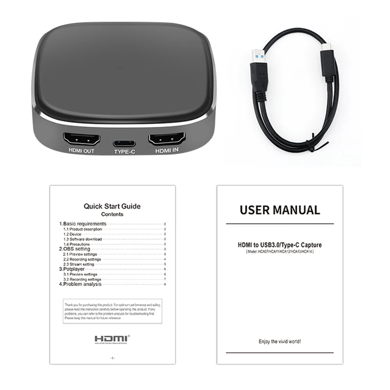 HDMI to Type-C video capture device has superior performance, good compatibility, simple installation and powerful functions. It can capture a single HDMI input signal, support HDMI Loop-out (except model HCA11), compatible with Windows 7, 8, 8.1, 10, Linux OS, and USB 3.0/Type-C interface of Mac OS. Compatible with a variety of USB3.0 chipsets (Intel, Renesas, ASMedia, Fresco Logic), backward compatible with USB2.0. Its USB3..0and Type-C output meets UVC and UAC standard,without having to install drivers and settings ,the real plug-and-play,easy to useFeature