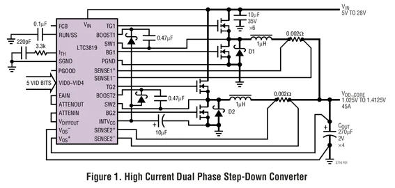 The LTC3819 is a 2-phase, VID programmable, synchronous step-down switching regulator controller that drives two N-channel external power MOSFET stages in a fixed frequency architecture. The 2-phase controller drives its two output stages out of phase at frequencies up to 300kHz to minimize the RMS ripple currents in both input and output capacitors. The 2-phase technique effectively multiplies the fundamental frequency by two, improving transient response while operating each channel at an optimum frequency for efficiency. Thermal design is also simplified. An operating mode select pin (FCB) can be used to select among three modes including Burst Mode® operation for highest efficiency. An internal differential amplifier provides true remote sensing of the regulated supply’s positive and negative output terminals as required in high current applications. The RUN/SS pin provides soft-start and optional timed, short-circuit shutdown. Current foldback limits MOSFET dissipation during short-circuit conditions when the overcurrent latchoff is disabled. OPTI-LOOP compensation allows the transient response to be optimized for a wide range of output capacitors and ESR values.