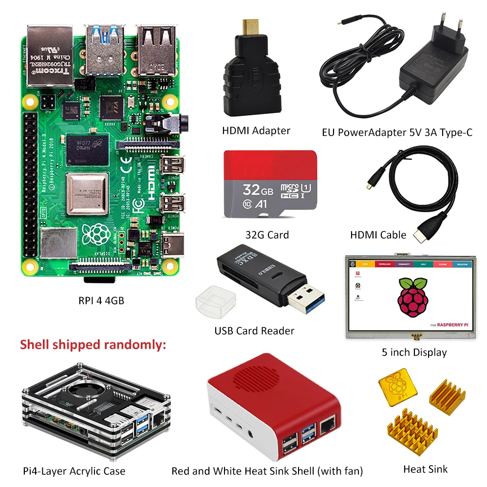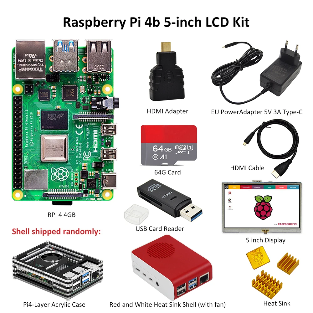 Raspberry Pi 4 Model B kit with 5-inch display PI 4B 2GB4GB : Board+Heat Sink+Power Adapter+Case +3264GB TF card+HDMI Cable